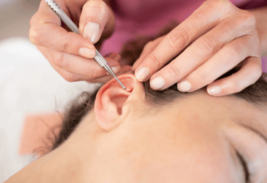 Aplicação de pontos na orelha para tratar dores, ansiedade, insônia, compulsões e desequilíbrios hormonais.